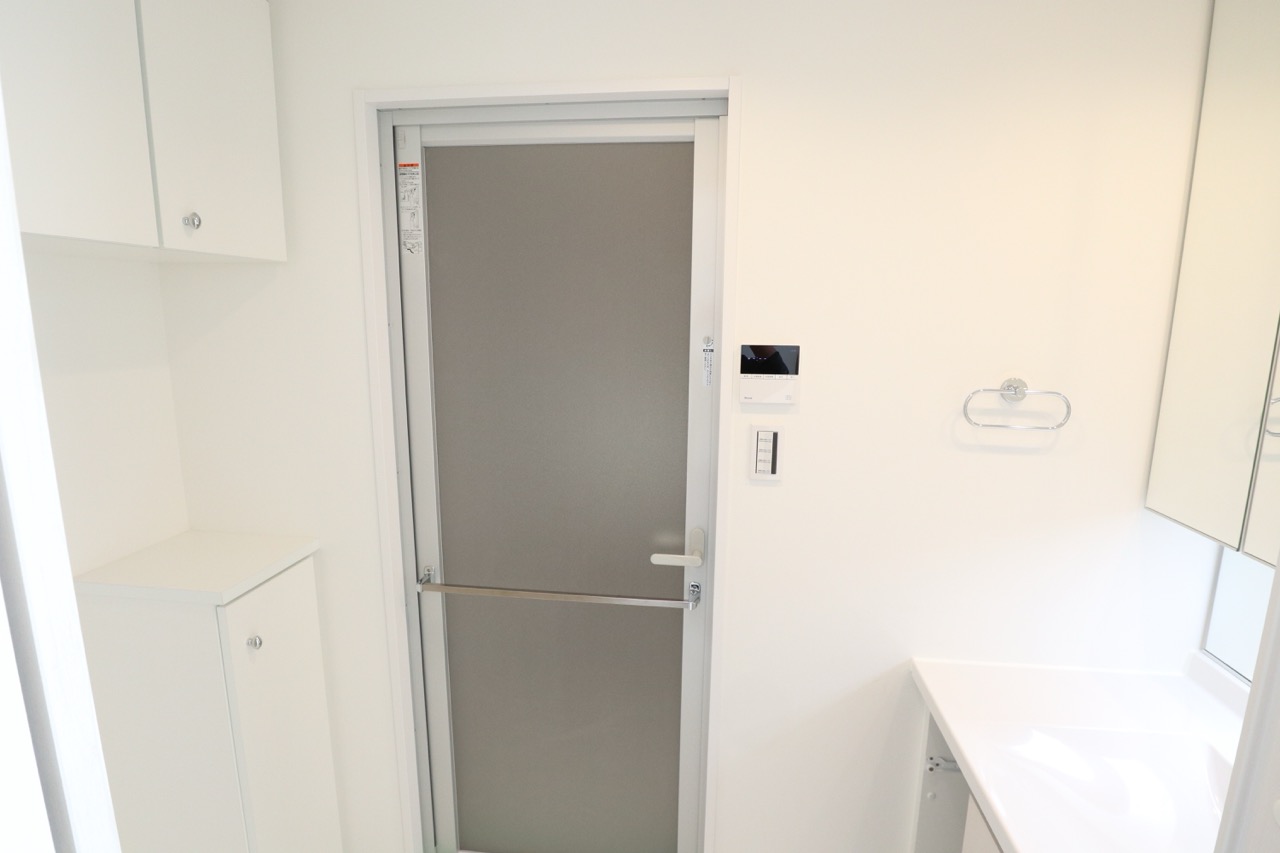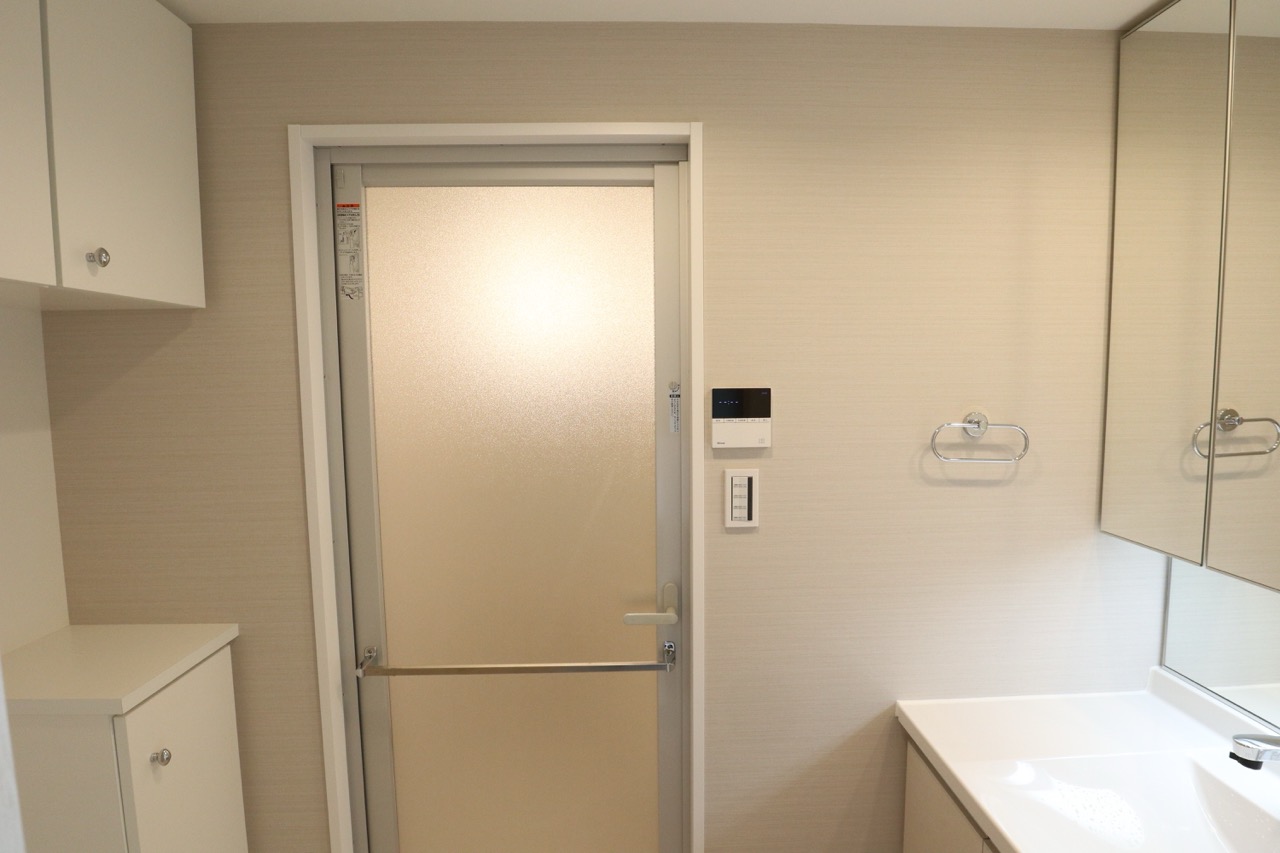 洗面鏡と合わさってより空間が広く感じられる配置を意識しています。