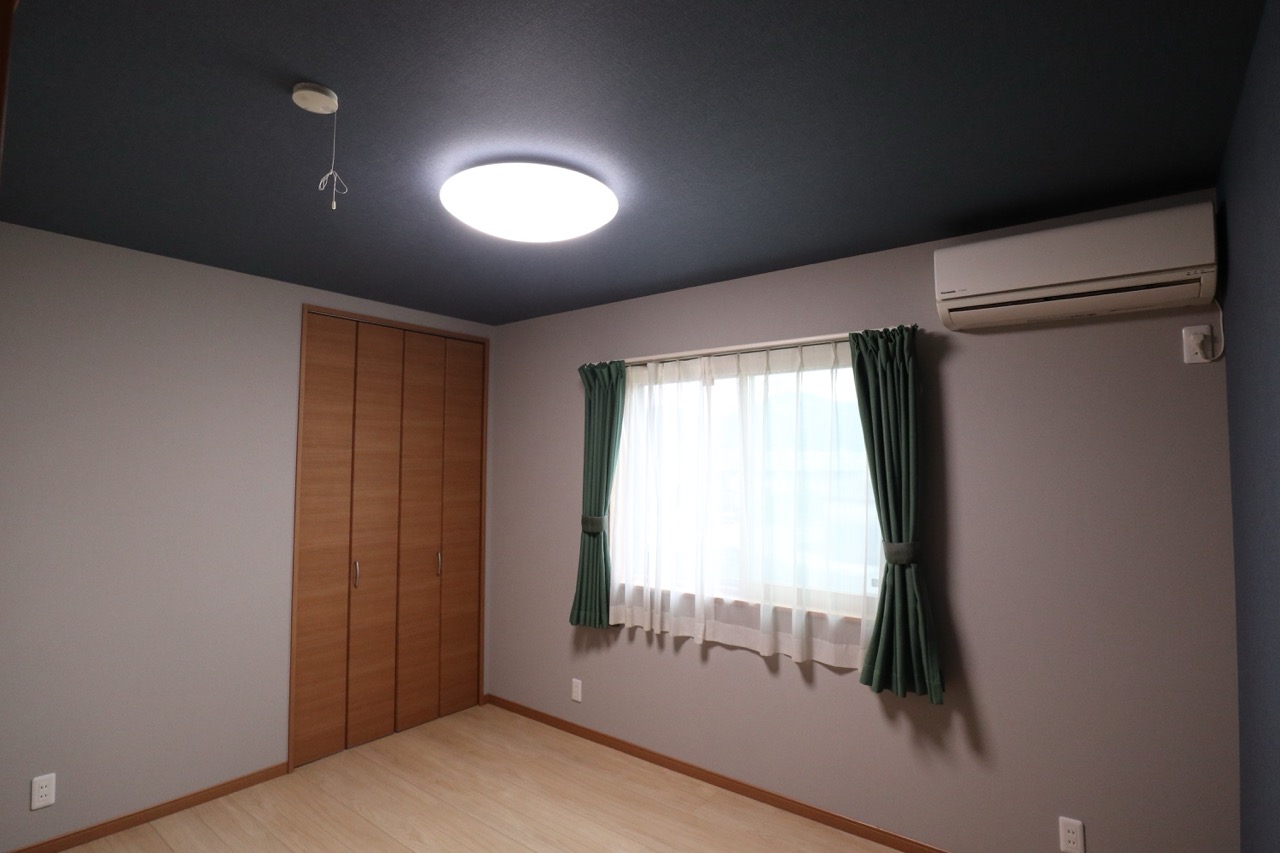 6帖の寝室にはネイビーの織目調クロスとグレークロスを組み合わせています。