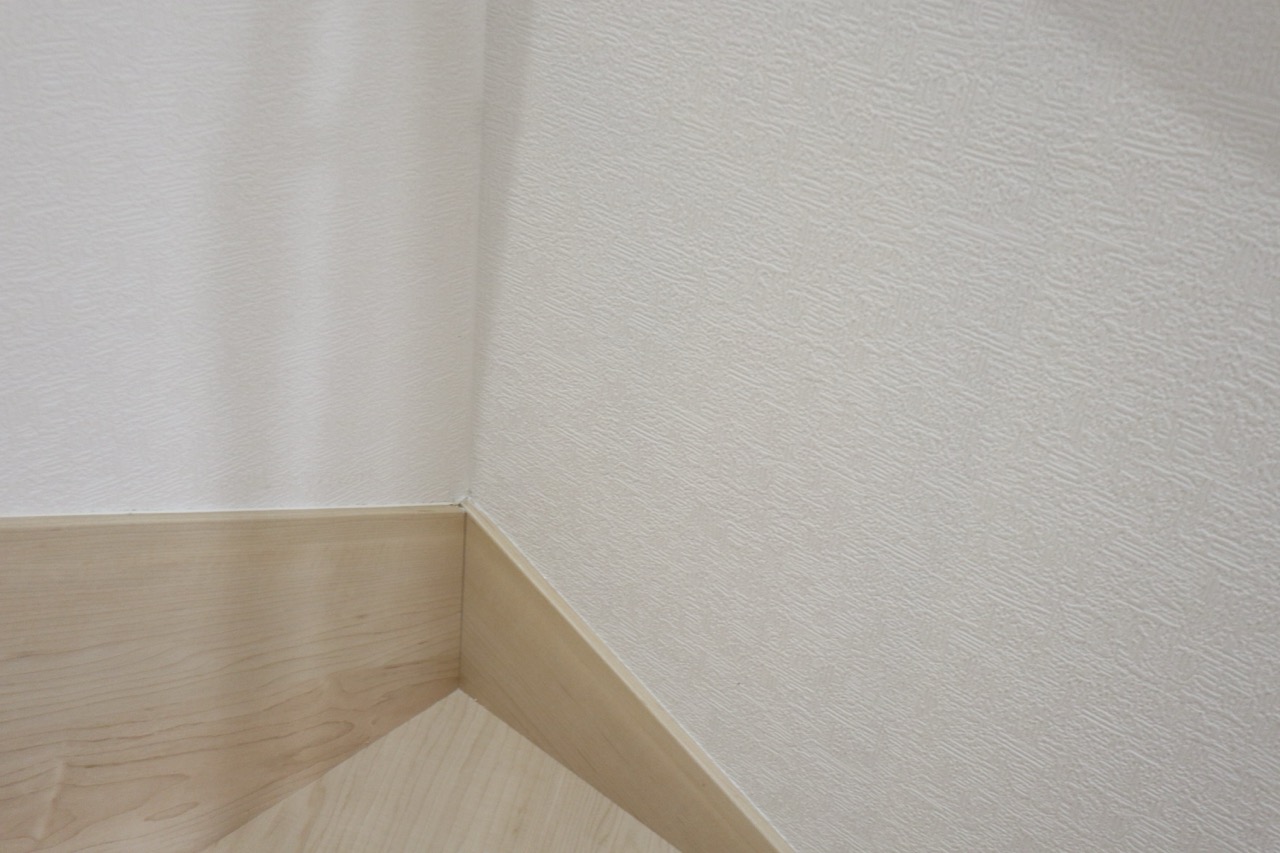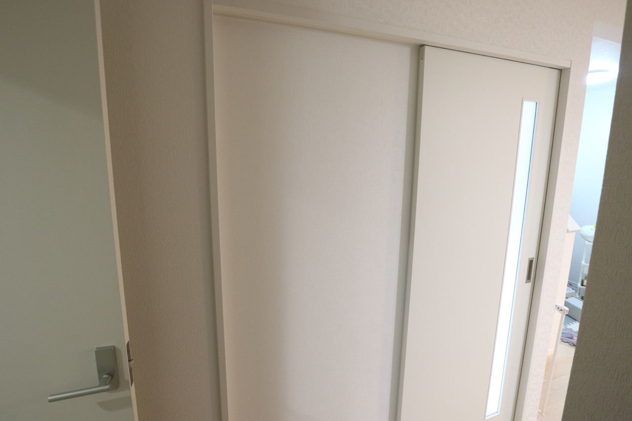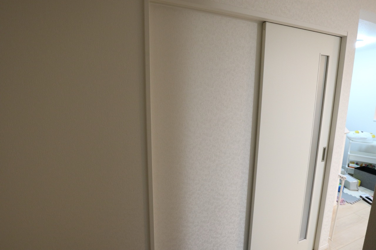 補修用のクロスは引き戸の裏側をはがして使用、引き戸の裏側には既存のクロスと似たものを施工しています。
