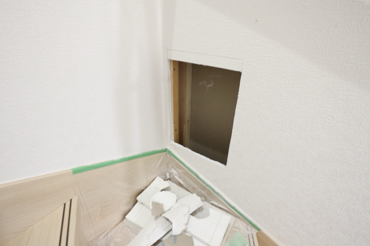 石膏ボードを継ぎ当てて穴補修しています。