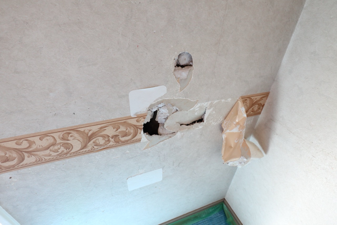 大小いくつかの穴があったため、小さいものはパテ補修し、大きなものはボードを継ぎ当てて補修しています。