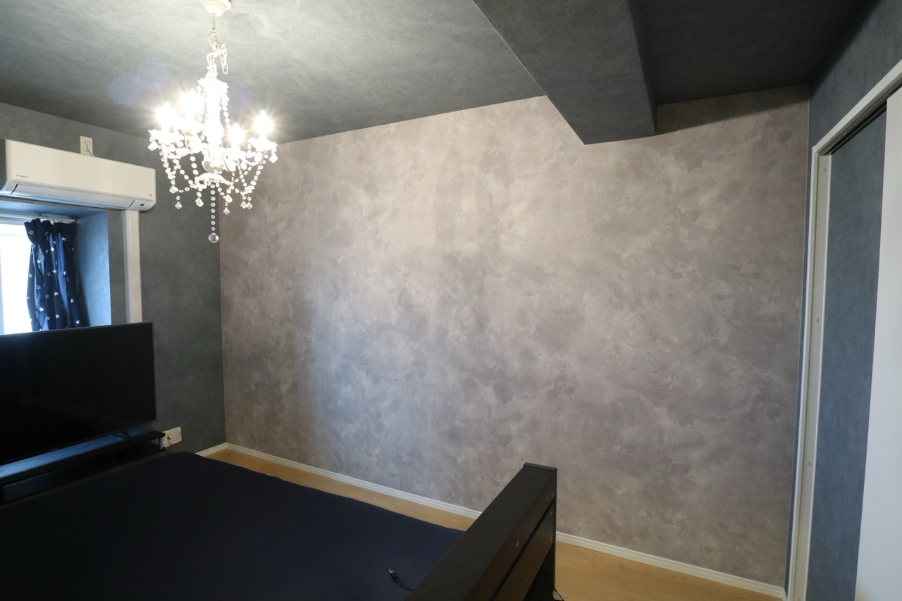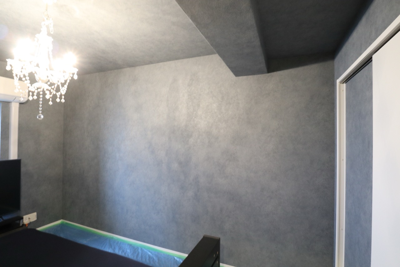 割れをパテ処理してグレーのアクセントクロスを施工しています。