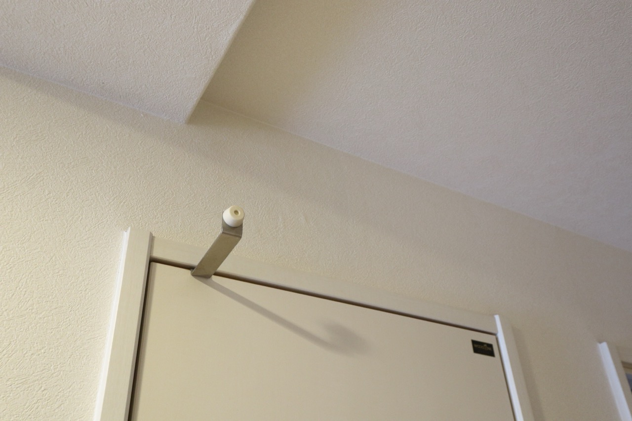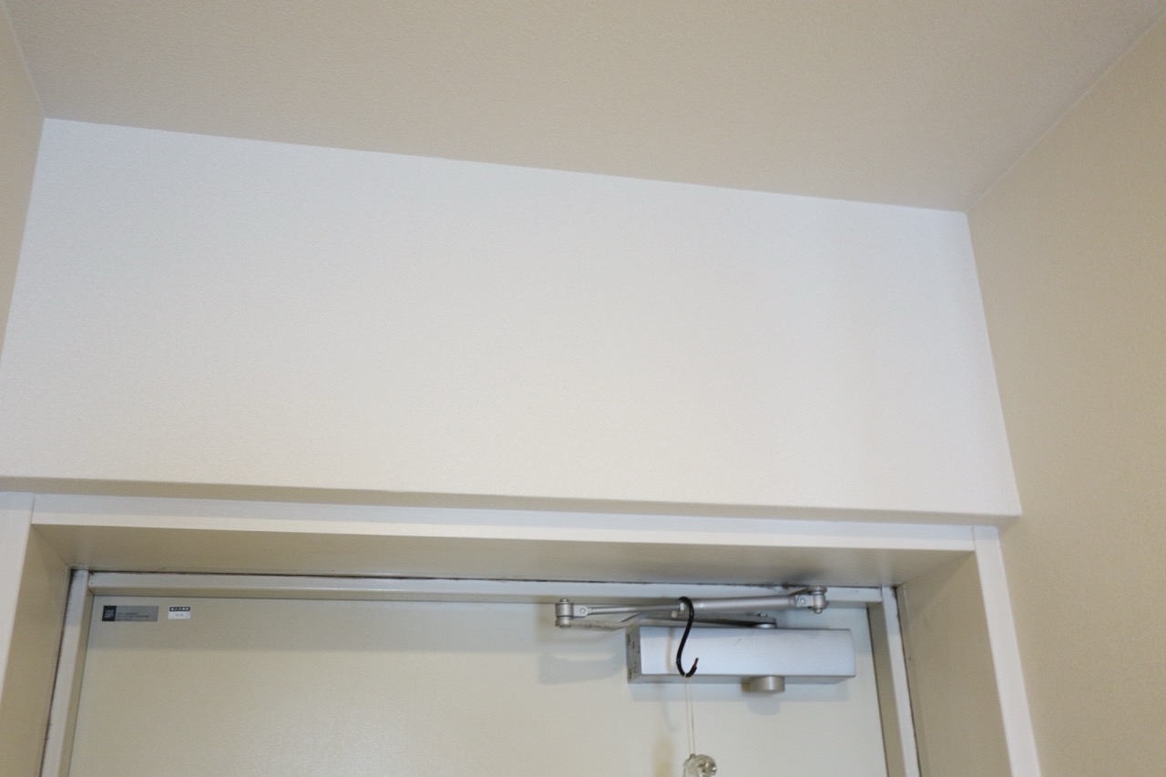 ドア上のヒビ割れはビスで補強してパテ処理し、既存のクロスを使ってパッチワークしています。