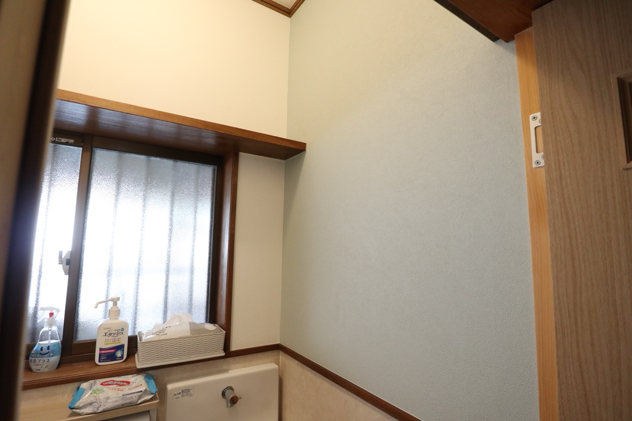 ついでにトイレのアクセントも少し濃いめのブルークロスに張り替えています。