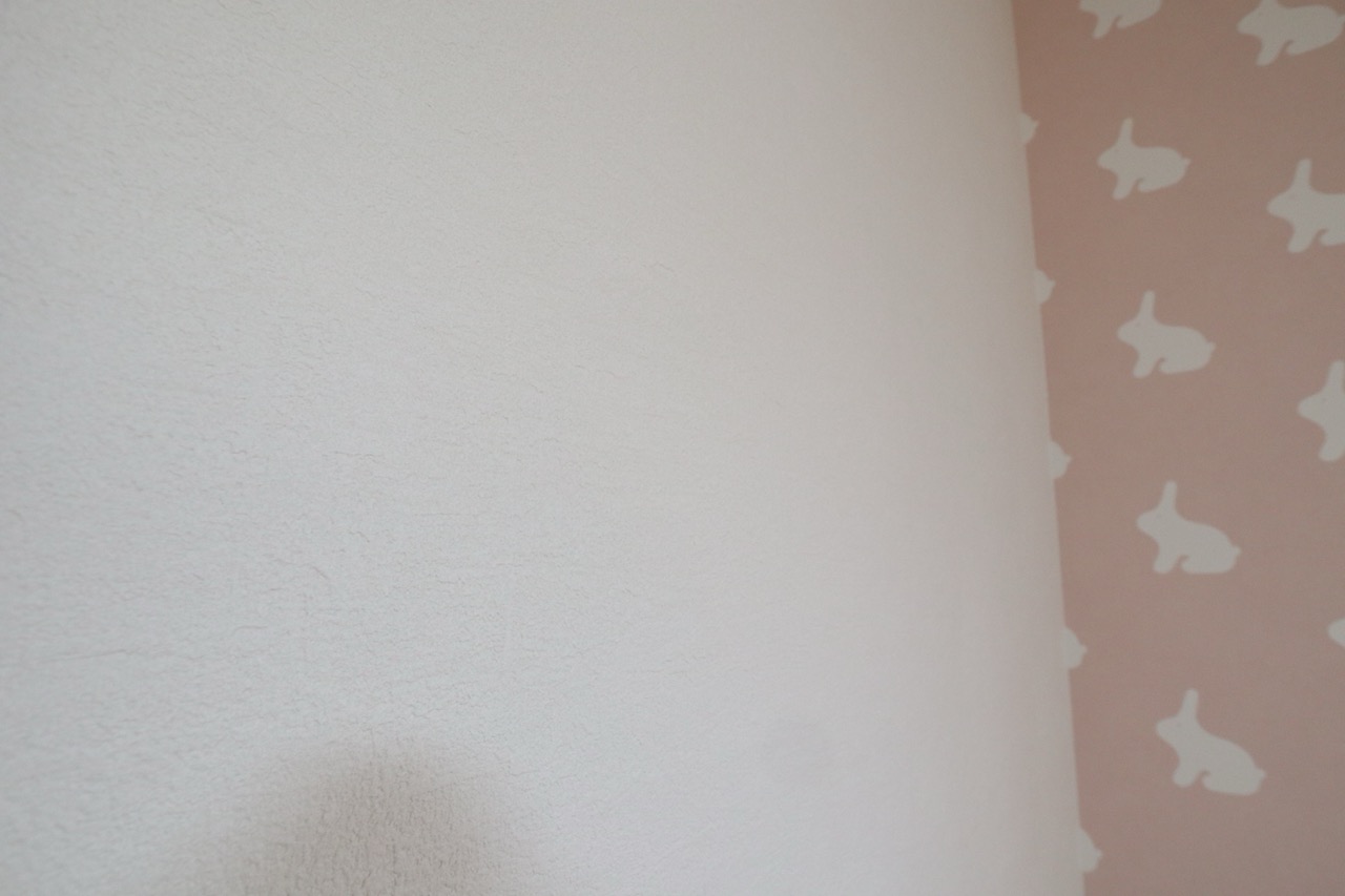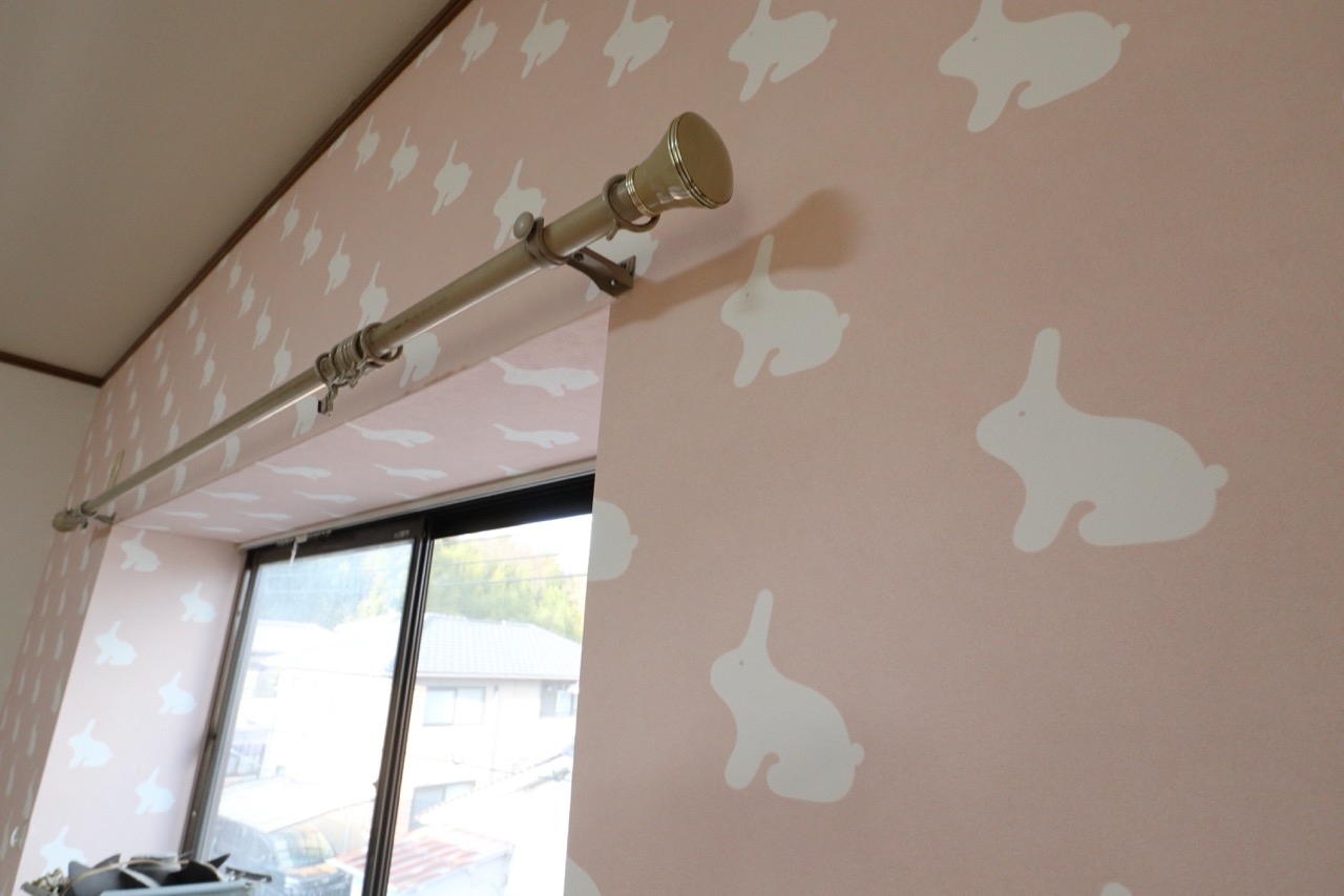 一面にお子さまチョイスのうさぎ柄ピンククロスを施工しました。
